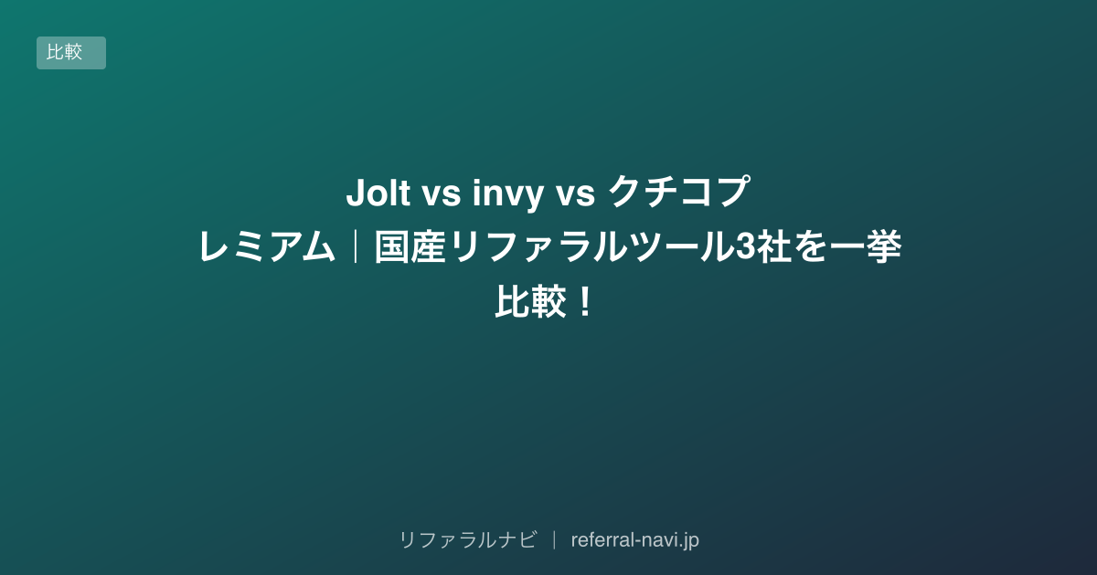 国産リファラルマーケティングツール3社(Jolt・invy・クチコプレミアム)を機能・料金・対象業種で徹底比較。BtoB・BtoCそれぞれに最適なツールがわかります。